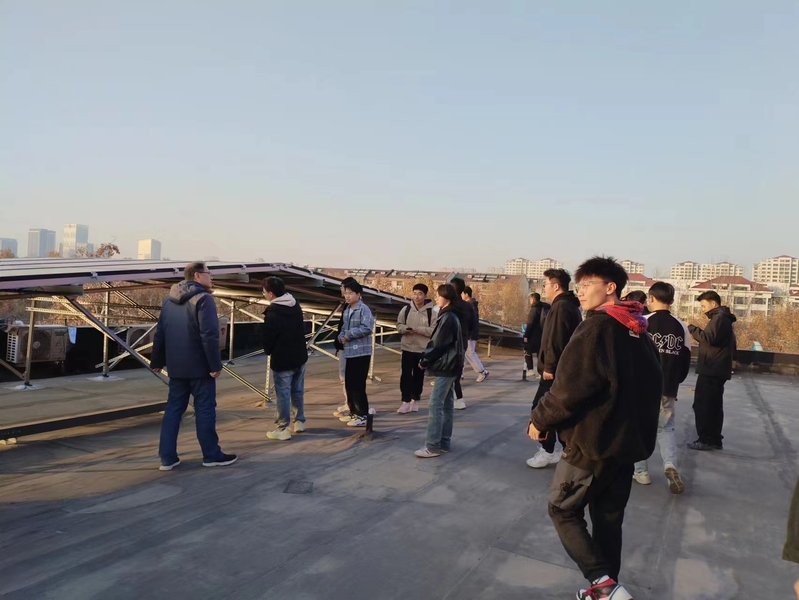 在参观现场,胡金宇就学校光伏发电项目规模、每年发电量和发电使用率及学校供暖现状、1#换热站运行管理状况、换热站供暖区域等情况向全体同学进行了详细介绍。同学们饶有兴趣的听取介绍,并不时提出问题与陪同人员进行交流。