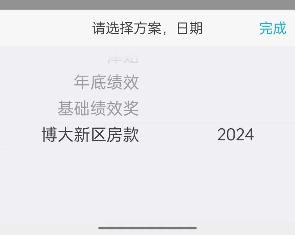 然后向下滑动,选择最后一个工资方案“博大新区房款”,如图二所示,点击“完成”。