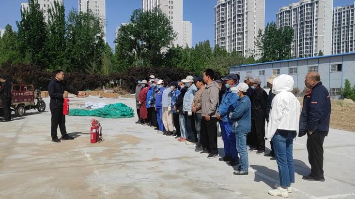 实际操作培训时,演练人员示范了“提、拔、握、压”的灭火器使用要领,站在上风口用灭火器对准火源根部精准扑灭。